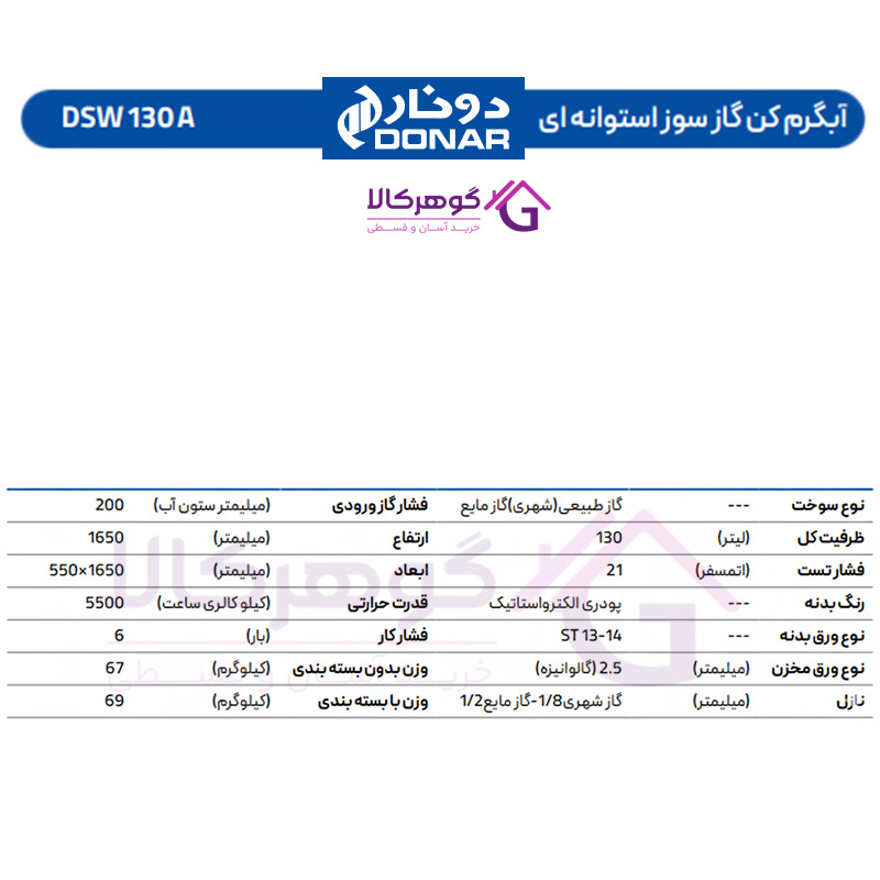 آبگرمکن گازسوز استوانهای دونار مدل DSW 130 A